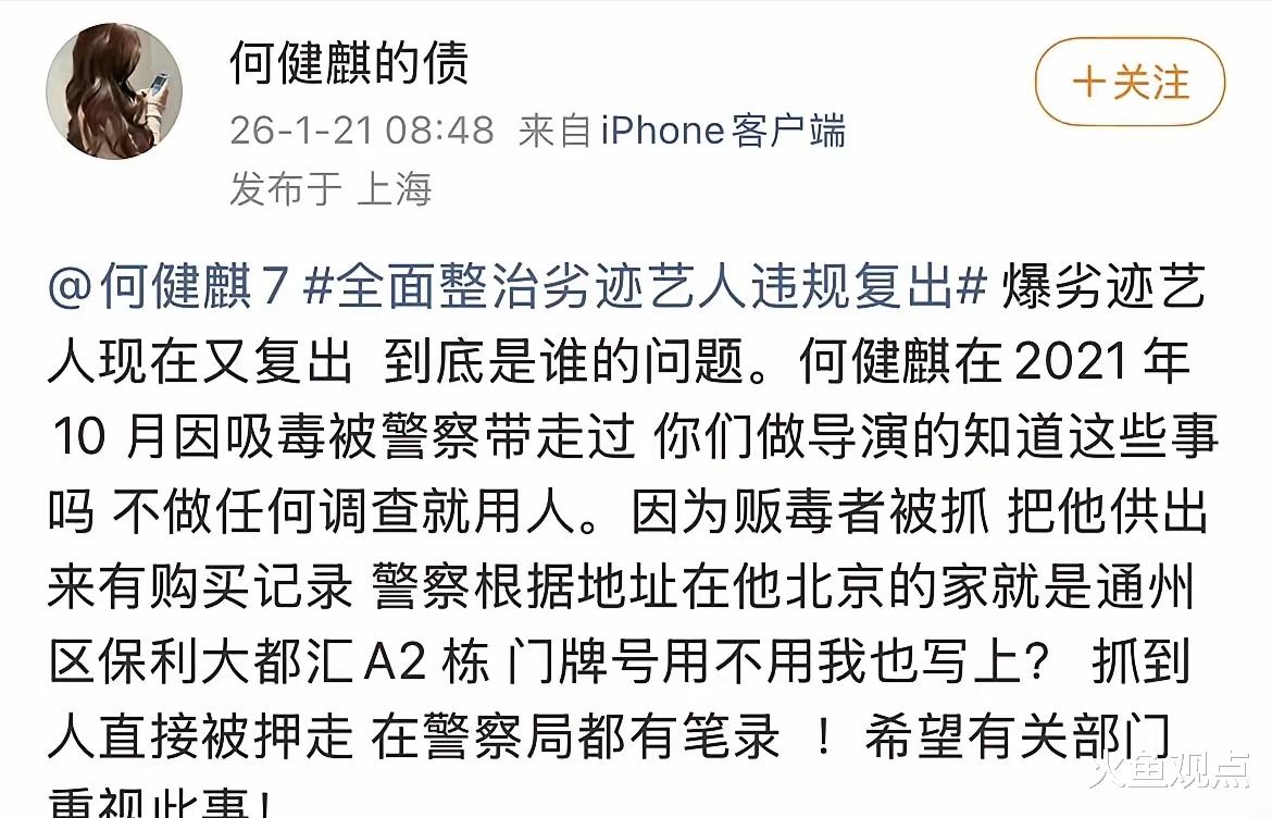 何健麒还曾因涉毒被北京警方带走,经尿检、血检和毛发检测,为了掩盖被检测的痕迹,