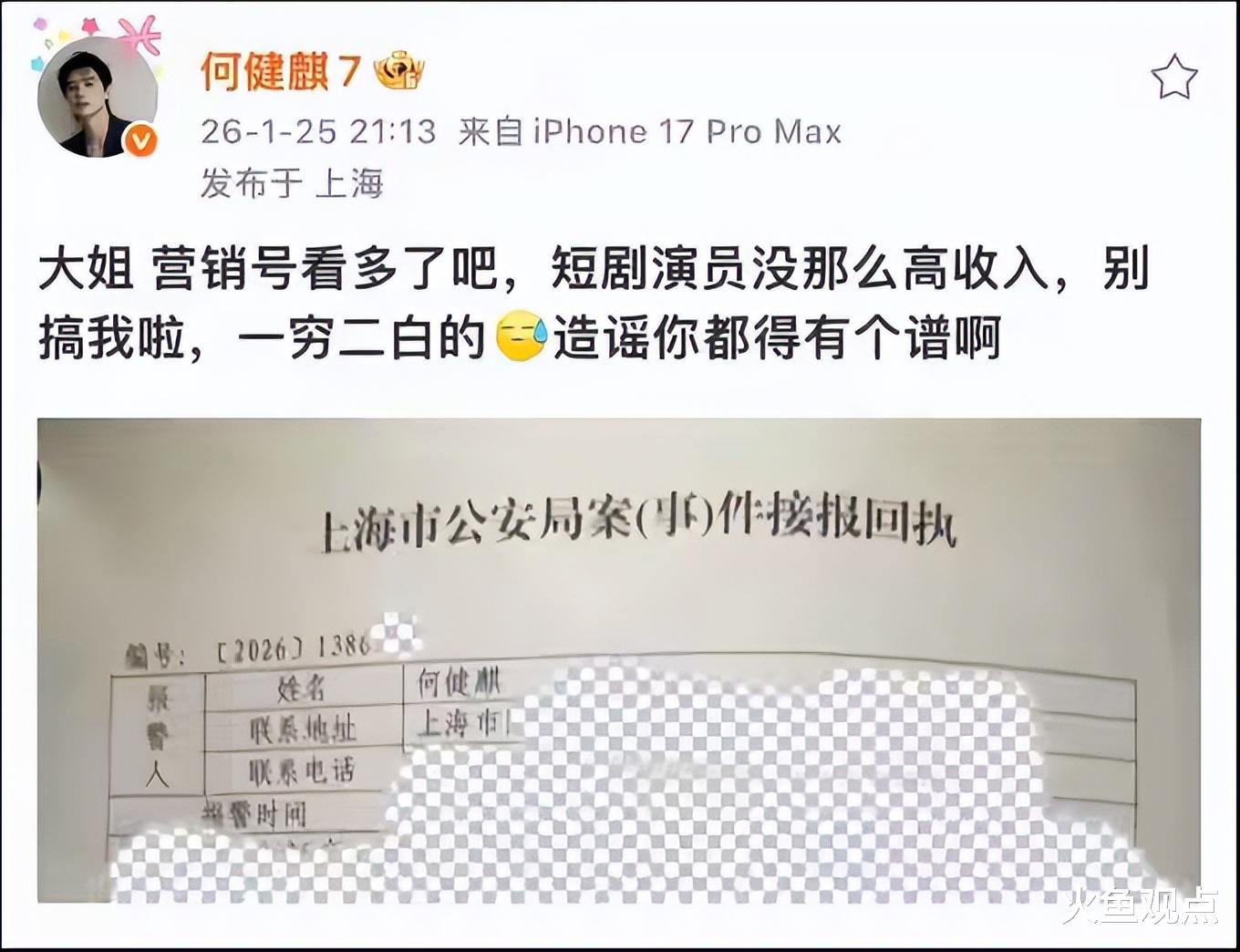 为了自证清白,何健麒还一并抛出报警回执单,表明个人的立场。
