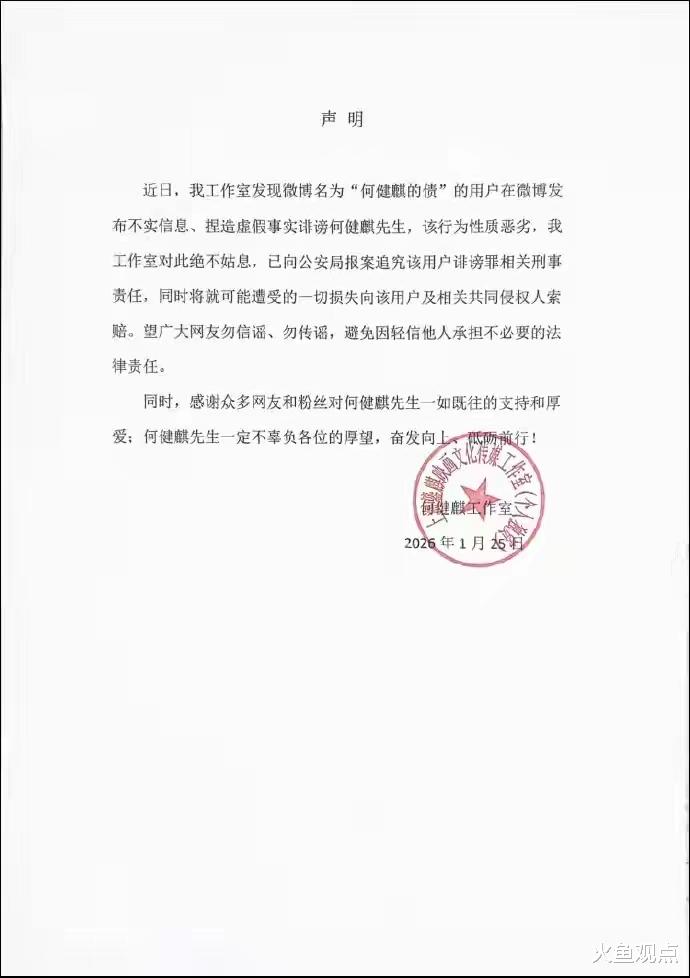 何健麒工作室也第一时间发布公开声明:
