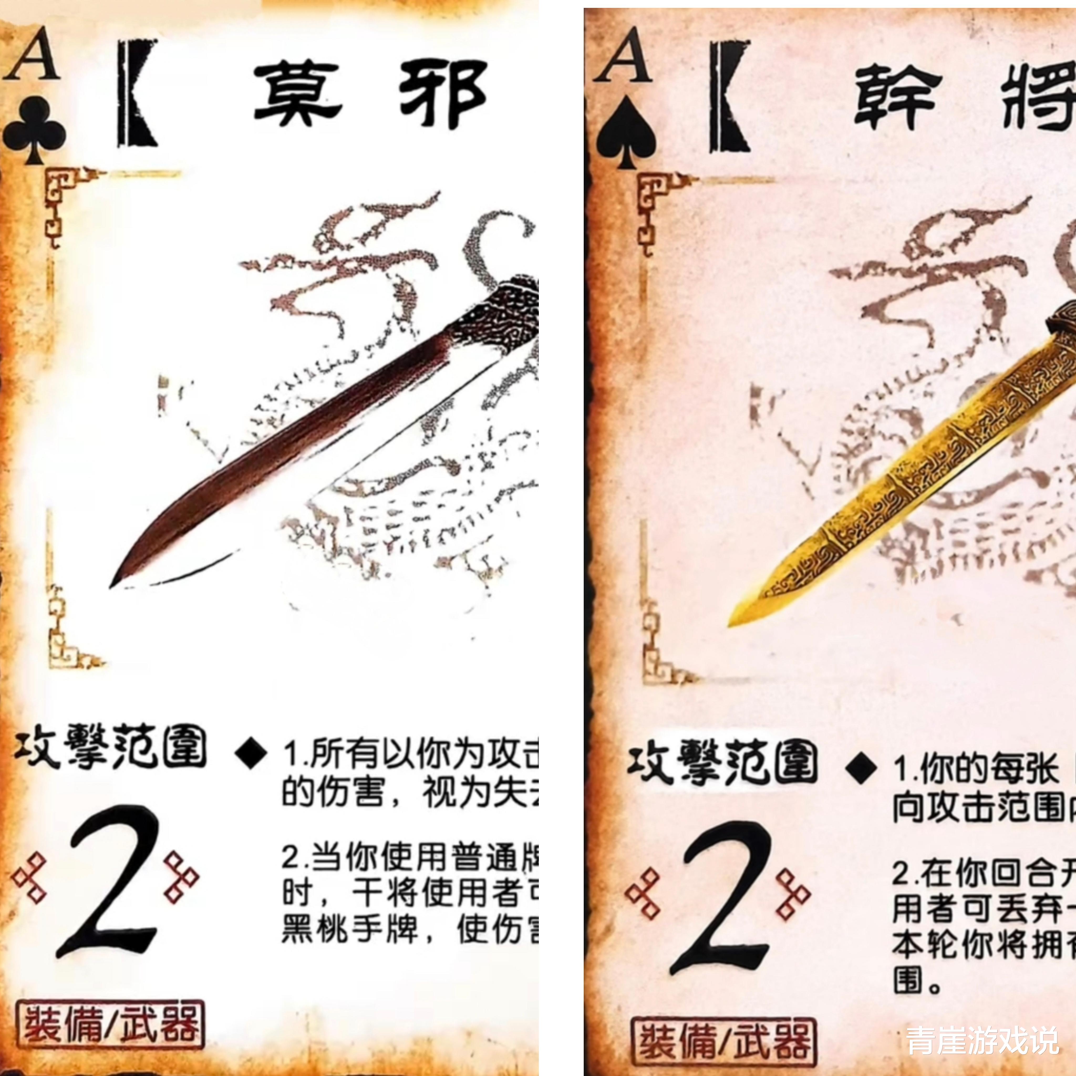 莫邪同样具备2点攻击范围,武器的效果是【绝情】,第一反应就是非常克制卖血武将们,正常情况下装备莫邪的效果和玩张春华没两样。但如果莫邪和干将的使用者配合,造成伤害时能加伤!没错,本来失去体力就克制卖血武将们,再有一个加伤效果,在莫邪面前的卖血武将都不用玩了!