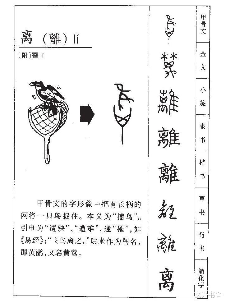 追溯 “离” 的字源,其本义远非今时的 “分离” 所能概括。甲骨文里的 “离”,上为飞鸟,下为长柄网,是一幅 “以网捕鸟” 的具象画面,本义为擒获;小篆又融草、鸟、网于一体,字形的演变让其本义渐隐。