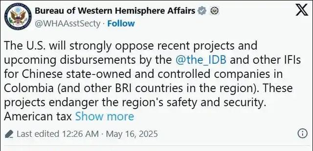 彭博社消息称,5月16日美国正式向国际开发银行体系表明“反对态度”,不支持为中资企业在哥伦比亚的项目给予贷款。