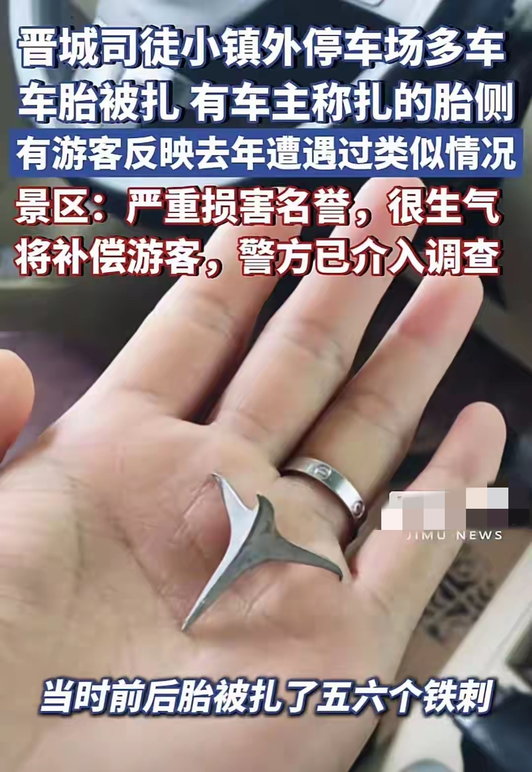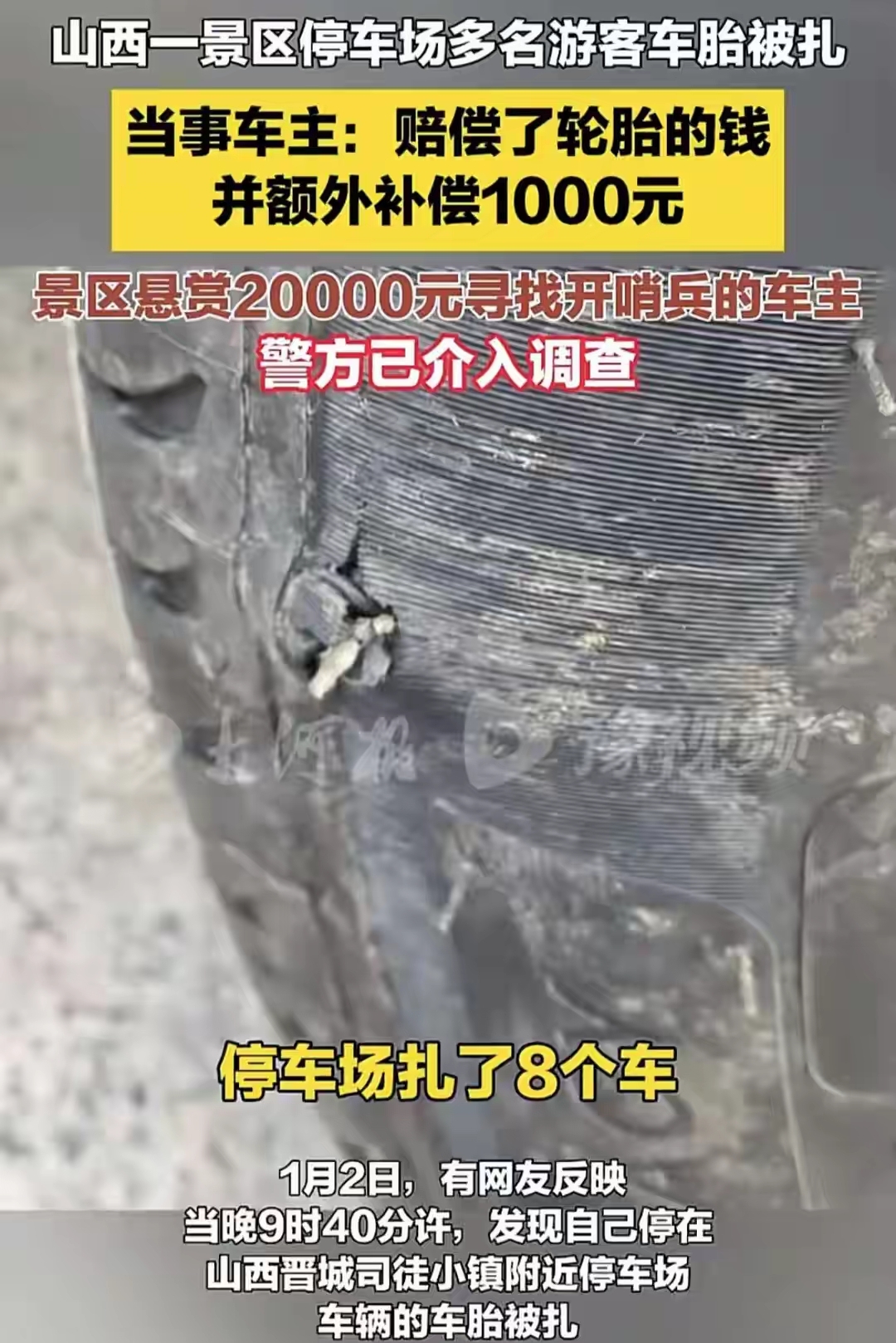 2026年1月2日晚上,有网友发视频,自己元旦假期来到司徒小镇游玩,结果回家时发现停车场上停的好的汽车被扎坏了,看伤口不像是扎了钉子,而是被人为故意扎伤的,想补胎都不行,只能是换轮胎。