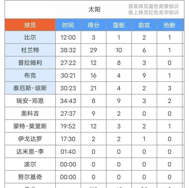 第二节太阳队这边泰厄斯琼斯连续得分,布克与比尔继续打铁,杜兰特很给力,太阳队依然无法改变场上的局面,灰熊队有贾伦杰克逊这个强点的加持,太阳队内线防守完全被打爆,他们依然很困难啊!上半场太阳队55-69落后灰熊!第三节杜兰特和泰厄斯琼斯继续给力,太阳的替补阵容发挥了,邓恩、莫里斯异军突起,帮助太阳缩小分差,三节战罢,太阳86-91落后5分!末节太阳努力缩小分差,他们一度只差两分,但是最后时刻灰熊连续打进,太阳还是防守不行啊,最终太阳输掉了比赛!