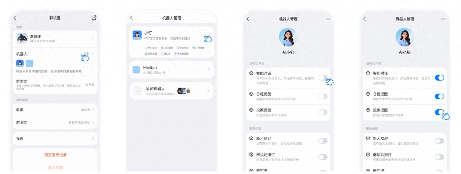 AI小钉是钉钉探索AI时代工作方式的全新尝试,Ta是钉钉群内“主动服务型Agent”。用户只需在新建的钉钉“内部群”内@AI小钉,即可通过自然语言对话,查询聊天记录、管理任务、调整群设置等。存量钉钉“内部群”的群主和管理员,可在群设置中添加配置“AI小钉”为群机器人,开启使用。