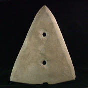 良渚博物院馆藏的石犁呈等腰三角形,两侧单刃部,中间钻有两孔,尾部有一长形内凹。使用时,石犁需要夹嵌在一个有底座有盖板的木座里,再通过石犁上的穿孔,用木销钉把石犁与木底座固定在一起。在木犁底尾端有装置犁辕的榫口,用于安装犁辕。良渚古城遗址公园的犁应该是这个样式。