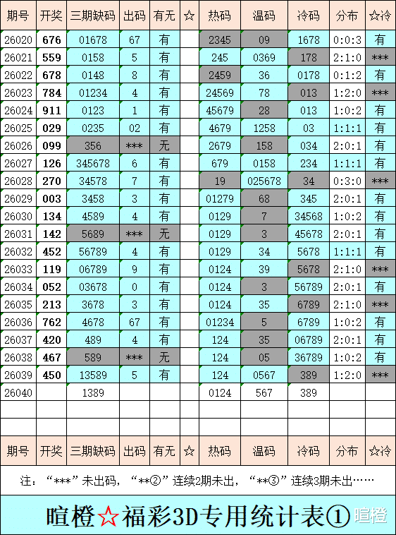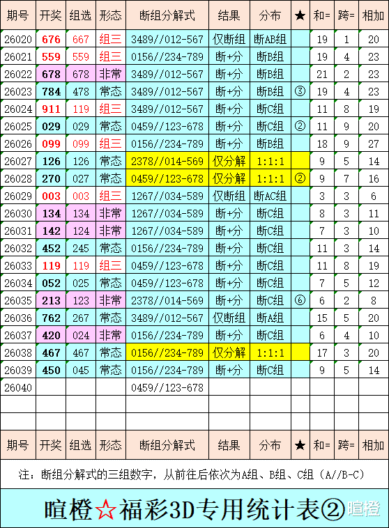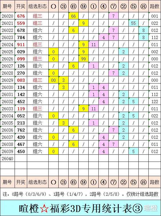 26040期:暄橙福彩3D综合条件(本期将在2月9日21:15开)一、上期回顾 ☆1、上期开奖号:4 5 0。2、和值= 9,跨度= 5。3、常态组六,012路组合。4、热度分布(热:温:冷)1:2:0。二、本期条件 ☆1、三期缺码:1389。2、热:0124,温:567,冷:389。3、断组分解式:0459//123-678。4、四胆:2678;三胆:278。三、术语解释 ☆1、三期缺码:0至9这十个自然数当中,未在近三期开奖号出现的数字。2、热度(热温冷):自然数0至9,在近七期开奖号中,出现3次及3次以上的数字,称为热码;出现2次的数字,称为温码;出现1次和未出现的数字,称为冷码。某个数字在开奖号中出现几个,就按几次计算。3、断组分解式:将0至9这十个自然数,分成三组数字,从前往后依次为A组(4码)、B组(3码)、C组(3码),一般情况下,有一组数字不出码,偶尔会有两组数字不出码。A组不出码的情况相对较少。断组为主,分解为辅。4、常态组六号码:同时包含大数、小数、奇数、偶数、质数、合数的组六号码,共有72注。统计表中,简称“常态”。5、非常态组六号码:全大数、全小数、全奇数、全偶数、全质数、全合数等六种形态的组六号码,共有48注。统计表中,简称“非常”。★提醒:彩市有风险,参与须谨慎!水平有限,仅供参考!