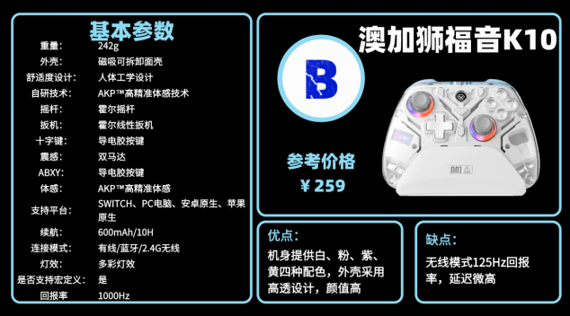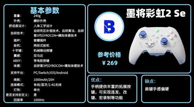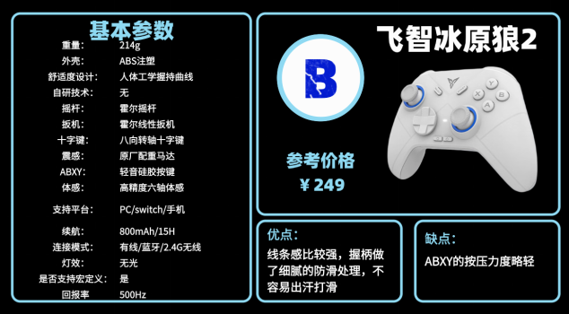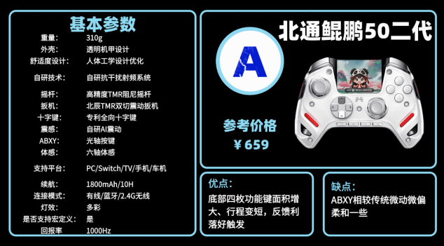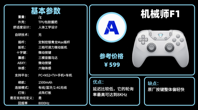 2:在核心性能方面,它针对FPS游戏优化,配备碳膜摇杆,支持2000级分辨率,有线模式1000Hz回报率(2.4G/蓝牙125Hz),操作更顺滑、微操精准,边缘金属环和自适应校准延长了使用寿命。十字键是可替换微动,响应清晰;顶部扳机为霍尔板机,阻尼感适中,并支持两段扳机锁切换。手柄支持三模连接,兼容PC、Switch、安卓及iOS设备,带陀螺仪,重量约240g,内置1000mAh电池续航约20小时。