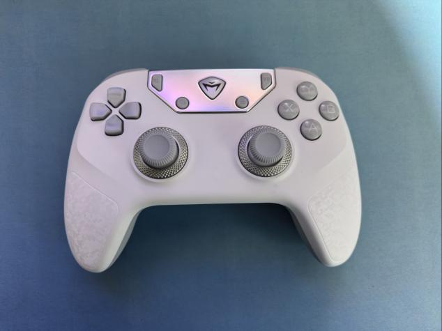 1:它在外观上延续了简约科技风,白色机身配合醒目的绿色摇杆帽,另外还有蓝色和粉色可选,满足玩家个性化需求。手柄提供丰富的拓展按键,可实现连发、改键、宏录制等功能,不用额外软件就可以快速修改配置。背部采用包胶握把设计,不仅握持舒适、防滑效果出色,也提升了整体质感。肩键手感偏硬,顶部还有两个自定义按键,支持单键绑定或宏录制,操作灵活;不过ABXY按键采用导电胶设计,键程有点长,高频连点时回弹略轻,习惯微动或硬段落感的玩家需要适应。