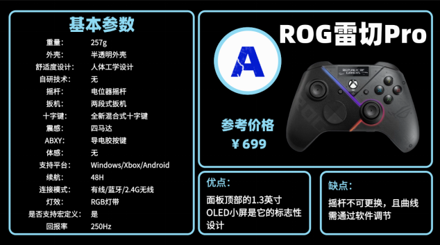 1:外观上这款手柄明显就是冲着“电竞机械感”去的,但设计思路偏稳健路线,没有走夸张RGB那套,而是靠材质层次与结构语言营造气质。半透明外壳、切割感线条以及经典ROG纹理把“硬核”和“质感”结合得比较自然,重量约257g,拿在手里和Xbox原装差不多,掌托贴合度不错,重心分布也比较均衡。顶部那块1.3英寸小屏算是点睛设计,不只是装饰,可以实时看连接方式、配置档、电量,还能刷动画,增加了不少“玩机乐趣”。摇杆是非对称布局,阻尼舒适、回中稳定,精细微操时比较好控制,但它不支持模块化替换,如果想要不同力度或手感只能靠软件调整。ABXY按键大字体视觉清晰,触发反应非常快;背面四枚可编程键布局合理,盲操作负担不大;扳机支持物理档位切换,还能实现扳机独立震动,赛车、射击、动作类游戏都能明显感到反馈层次更丰富。