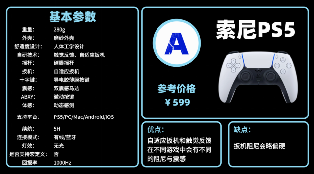 2:操控层面依旧延续索尼标志性的按键布局,熟悉PlayStation体系的玩家几乎不用学习成本。自适应扳机和震动系统算是它最大的技术优势,不同游戏呈现的力度、震感差异非常明显,赛车游戏里的油门阻尼、射击游戏中的武器回弹都能清晰体现,沉浸感相当强。不过在个别游戏里,扳机阻力会显得偏硬,触觉反馈偶尔也稍微“激烈”了一些,适应之后体验会好很多。手柄支持蓝牙无线和USB-C有线两种连接方式,延迟稳定、兼容PC与主机平台;同时提供触控板、麦克风和扬声器等扩展功能。续航大概在5小时左右,虽然不算突出,但支持插线游玩,续航焦虑基本可以忽略。