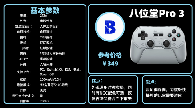 2:体验层面偏向实用与易上手。它支持三模连接,并能一键唤醒Switch 2,多设备用户日常切换会非常省心;非对称震动与多指位设计在动作与体感类游戏中体验更沉浸。续航方面1500mAh算中规中矩,大概一场长游戏或两三晚娱乐没问题;机身偏沉一点,但带来的好处是握感更稳定,不容易“发飘”。