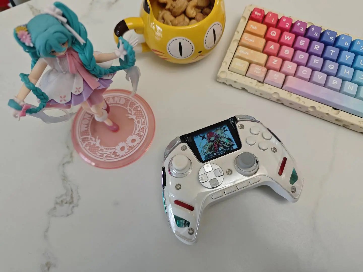 1:手柄更像是一件“能玩的数码潮玩”。机身提供白、粉、紫、黄四种配色,外壳采用高透设计,内部机甲结构、震动模组一览无余,再加上LOGO、摇杆环、ABXY按键与握柄上的RGB灯效同步闪动,赛博氛围比较浓。面壳是磁吸式结构,支持快速拆换与DIY装饰,想要个性化外观基本不用折腾太多。握在手里重量和稳定感都不错,霍尔摇杆与霍尔线性扳机带来的精准度明显比普通电位器更稳,特别是在赛车、射击类游戏里,细节控制和微操会更自信;只是无线模式125Hz回报率在极端竞技场景下略逊于有线,适合休闲与主流玩家,硬核极限党会更偏向有线。