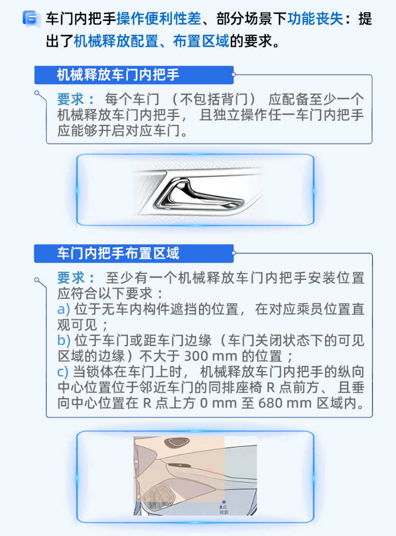 在车辆碰撞、起火等极端情况下,车内可能出现浓烟滚滚、漆黑一片的情况,若车内应急把手被内饰板隐藏,乘员很难快速找到逃生开关。对此,新国标要求,车内每个车门的机械应急把手,必须处于无遮挡、直观可见的位置,不能被内饰板隐藏;同时,要配备永久性图形标识,标识尺寸不小于10mm×7mm,颜色与背景对比强烈,夜间等阴暗环境下也能清晰识别;标识附近还需配备中文或图示操作说明,文字高度不低于6mm,确保乘员在慌乱中,能快速找到并操作应急把手。此外,国标还对车内把手的安装位置做了人体工程学测算,要求其位于车门或距车门边缘(关闭状态下可见区域)不大于300mm的位置,方便乘员快速触及。