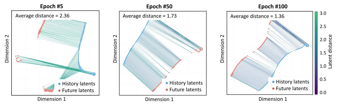 传统扩散策略往往采取 Noise-to-Action 机制,而 A2A 则直接在更具相关性的历史与未来动作分布间建立联系。为了更进一步拉近分布距离,我们在潜空间完成 Flow Matching 学习。具体地,在 Flow 训练目标函数中