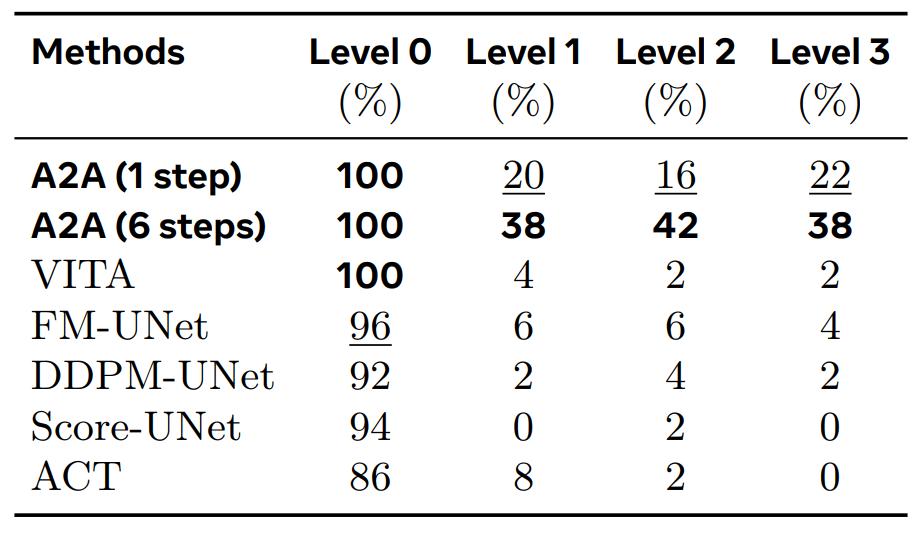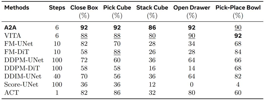 实验证明,这种设计使得起点与终点的物理距离极近且分布高度对齐。得益于极短的传输路径,A2A 仅凭轻量级 MLP 架构与单步 Euler 积分即可快速生成高质量动作。