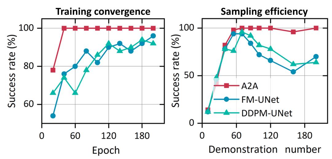 在多项仿真(ManiSkill, RLBench, LIBERO)与真实 Franka 机器人任务中,A2A 展现出了极佳的训练效率、推理速度、以及泛化能力。