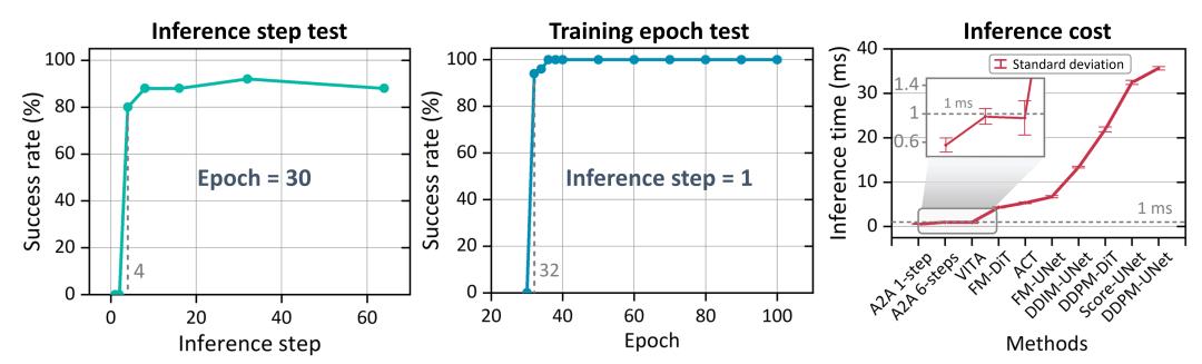 此外,推理速度方面,A2A 实现了亚毫秒级的极致推理速度,平均延迟仅约 1ms,在单步推理模式下延迟更是低至 0.56ms,比传统扩散策略快 20 倍,比常规流匹配方法(10 步)快 5 倍。