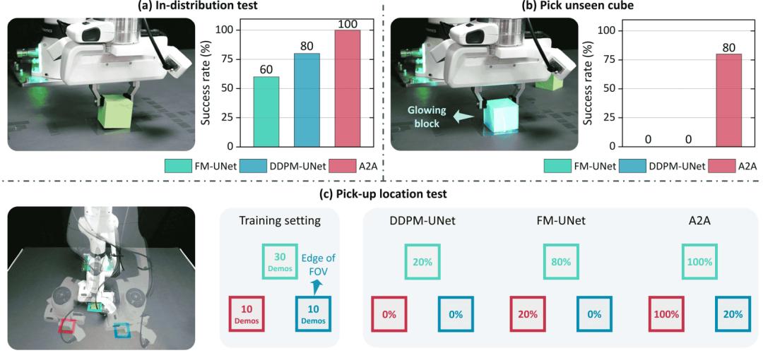最后,A2A 极大提升了视觉泛化性。例如,实验中将抓取木块换成从未见过的发光方块,传统扩散和流匹配策略均会彻底失效,而 A2A 仍可维持 80% 的高成功率。