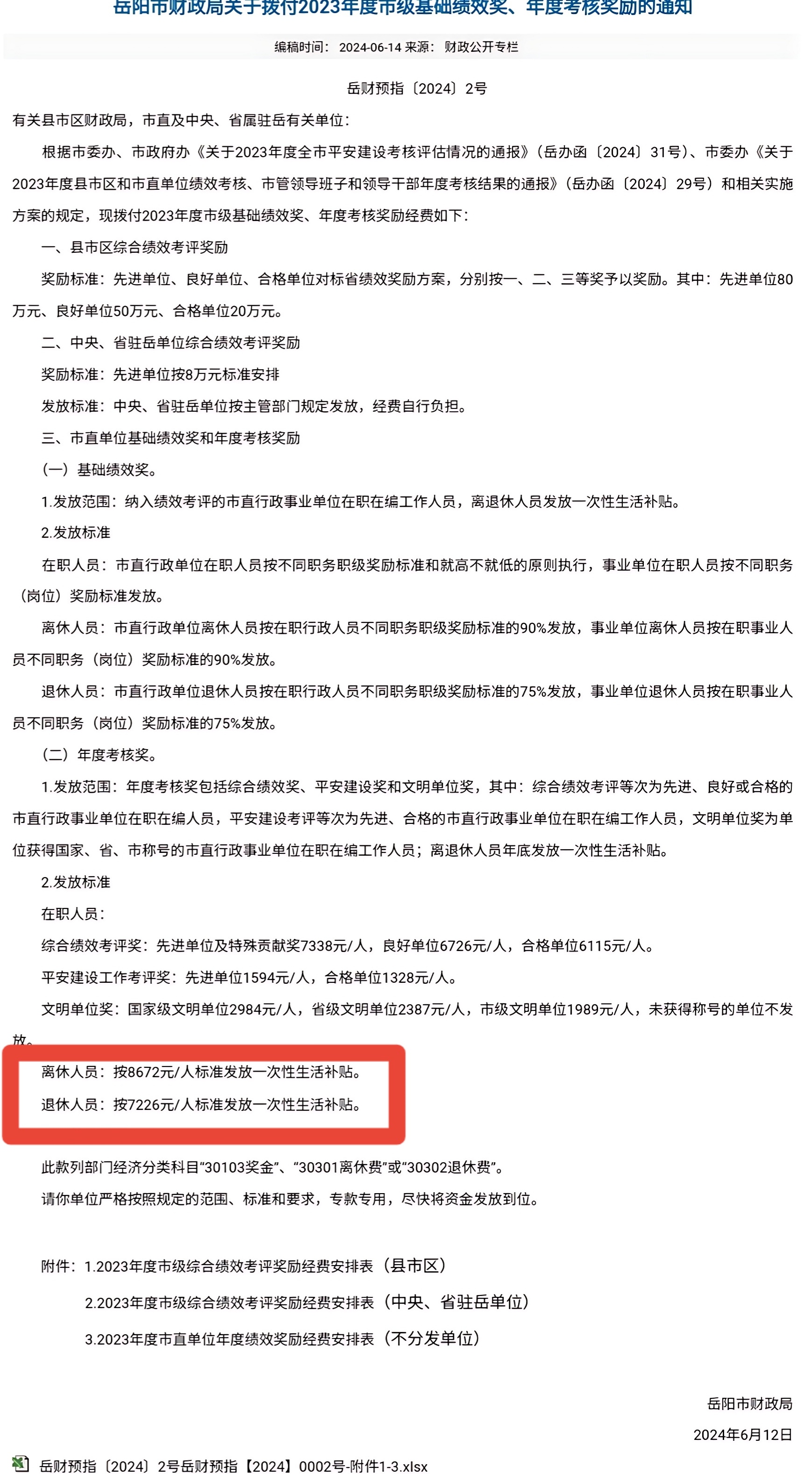 这个一次性生活补贴,属于年度考核范畴的,和在职人员比起来,一般是有差距的,还是以岳阳市为例,有综合绩效考评奖、平安建设工作考评奖、文明单位奖。