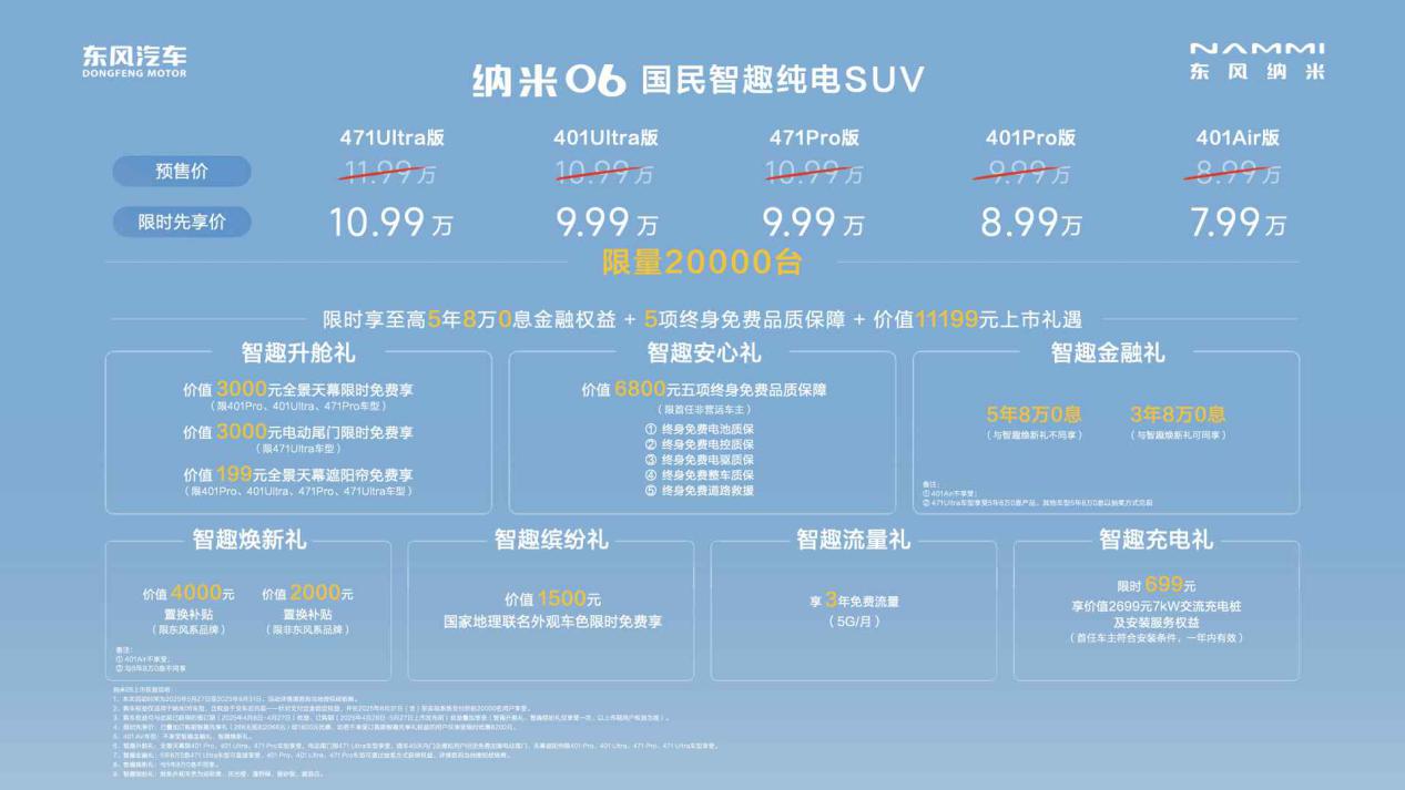 大可玩,尽情6。5月27日,东风纳米旗下“国民智趣纯电SUV”东风纳米06在武汉正式上市,限时先享价为7.99万元-10.99万元。作为一个听劝的品牌,东风纳米06为用户带来7大诚意权益,包括电动尾门和全景天幕限时送、五项终身免费品质保障、中国国家地理联名外观车色限时免费享、最高4000元置换补贴、至高享“5年8万0息”、送3年免费流量、699元享价值2699元充电桩及安装服务等众多的超有诚意权益。当产品超过期待、价格超出期待、品质越级领先,是给予用户最大的诚意,也是东风纳米赋能国民极致美好生活的最大底气。