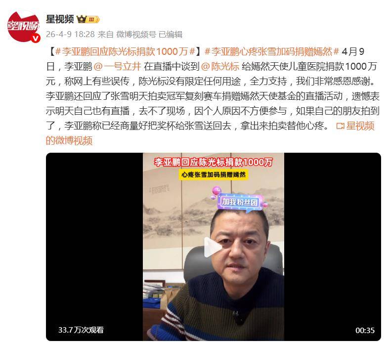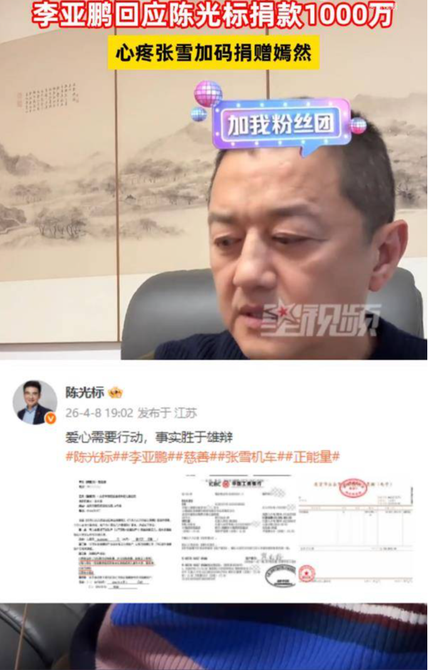 李亚鹏在直播间里的一番回应,把两桩备受关注的慈善捐赠推到了聚光灯下。一边是陈光标被传得沸沸扬扬的千万捐款,另一边是“张雪机车”创始人即将拍卖冠军赛车的加码支持,李亚鹏的几句话,算是给这场公益风波来了个“官方澄清”。