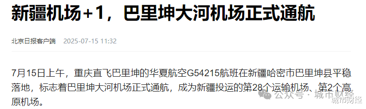7月,新疆巴里坤大河机场正式通航,成为哈密市第二座民用机场,也是新疆第28座民用运输机场。
