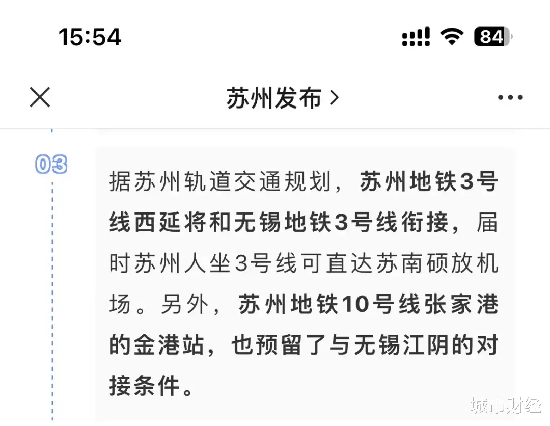 苏州地铁3号线西延将和无锡地铁3号线衔接,届时苏州人坐3号线可直达苏南硕放机场。另外,苏州地铁10号线张家港的金港站,也预留了与无锡江阴的对接条件。
