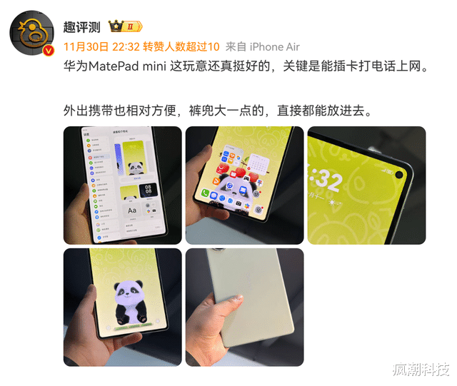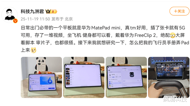 极致轻薄,更随身更好用。“外出携带相对方便,裤兜大一点的,直接都能放进去”,这是一位科技博主由衷的感叹,也是无数用户的共同心声。华为MatePad Mini将机身厚度控制在5.1mm,重量仅255g,用户可以轻松将其放入大部分随身小包,甚至是外套口袋里。摆脱背着沉重笔记本电脑满街跑的负担。对于通勤党和出差族来说,这种“存在感极低”的携带体验,本身就是一种巨大的解脱。