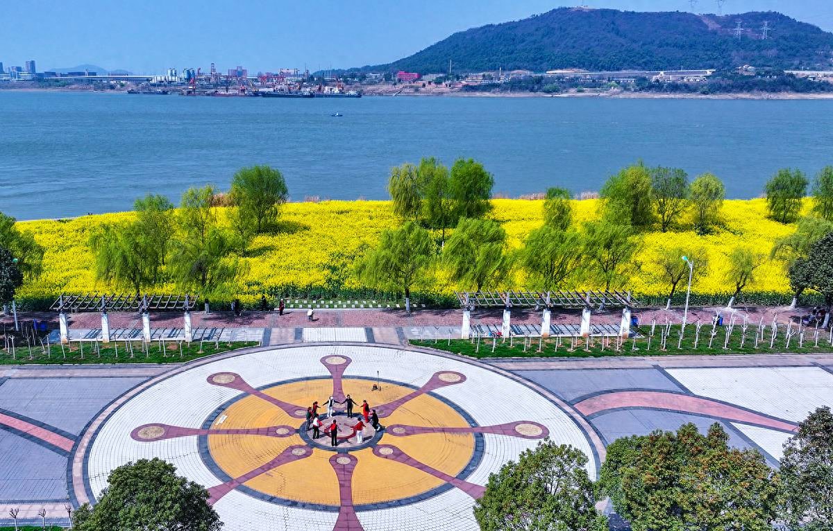 3月12日,鸟瞰中山舰博物馆油菜花海。花海面积约100亩,位于武汉市江夏区金口街中山舰路特一号的长江畔。近日,随着气温回暖,武汉的油菜花竞相绽放,金色的花海与青山绿水相映成趣,绘就一幅生机盎然的春日画卷。(湖北日报全媒记者 朱熙勇 摄)