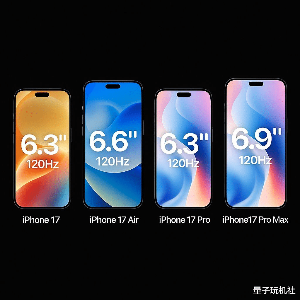 屏幕方面,iPhone17是6.3寸,iPhone17Air是6.6寸屏幕,iPhone17Pro是6.3寸屏幕,iPhone17ProMax是6.9寸屏幕,iPhone17全系列都支持120H值得刷新率,不过标准版的不支持ProMotion 技术,刷新率将固定在 120Hz,无法动态调整。算是补齐了高刷了。