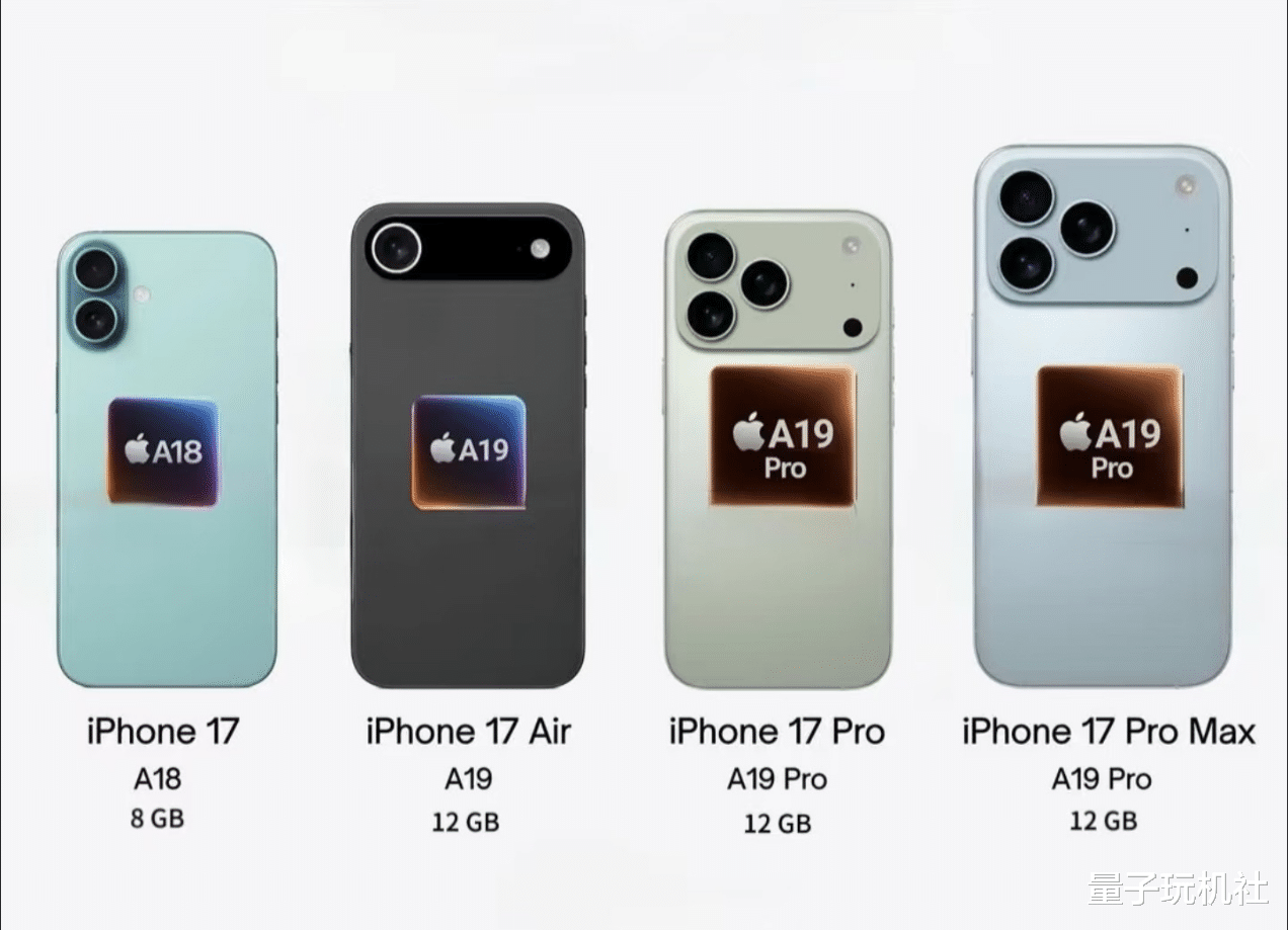 芯片方面,iPhone17和iPhone17Air,搭载的是苹果的A19芯片,而iPhone17Pro和iPhone17Pro,搭载的是A19Pro芯片。iPhone17Air可能会搭载苹果自研的C1 5G基带芯片。iPhone17搭载8G内存,而Pro、ProMax版本,都是12GB内存,Air版本可能也是12GB内存。