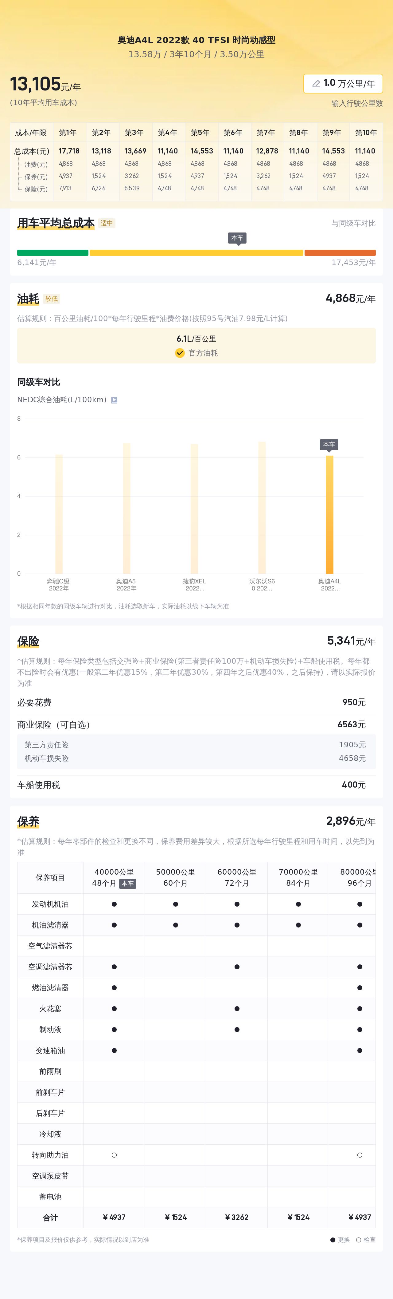 根据懂车帝官方的大数据分析,这辆二手奥迪A4L的十年平均用车成本大约在13473元/年,这在同级别车型中处于适中的水平。其中,油费约为6731元/年,保养费用约为2572元/年,保险费用约为4170元/年。值得注意的是,实际费用支出会根据车主的驾驶习惯、用车环境以及车辆维护情况等因素有所差异。