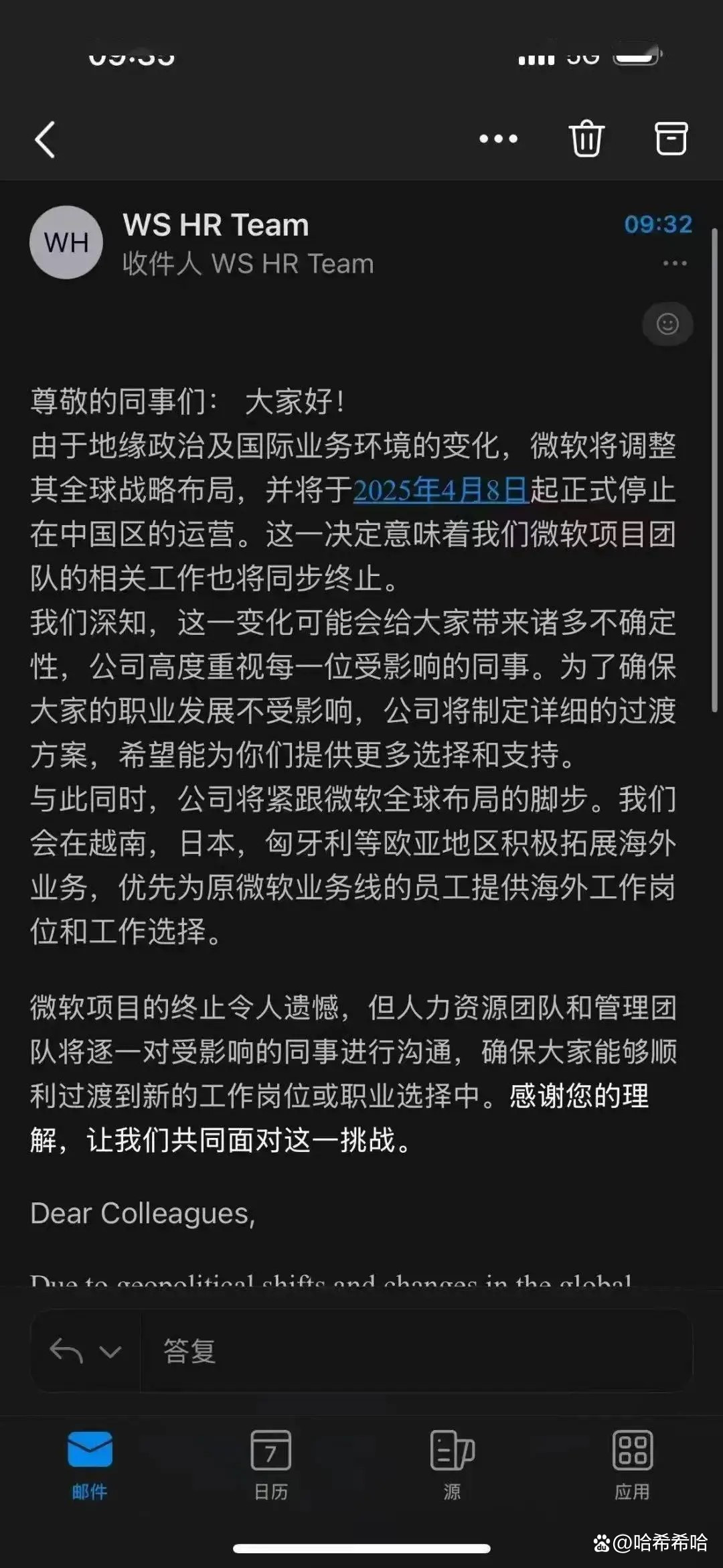 据《凤凰网财经》《每日经济新闻》等报道,网传邮件实际由微创Wicresoft发出。该公司是微软在华首家合资企业,成立于2002年,主要从事软件外包业务,微软持有其22.32%股份。邮件称,因“地缘政治及国际业务环境变化”,微创将于2025年4月8日停止在华运营,涉及上海、无锡、大连等地约2000名员工,裁员补偿为“N+1”。