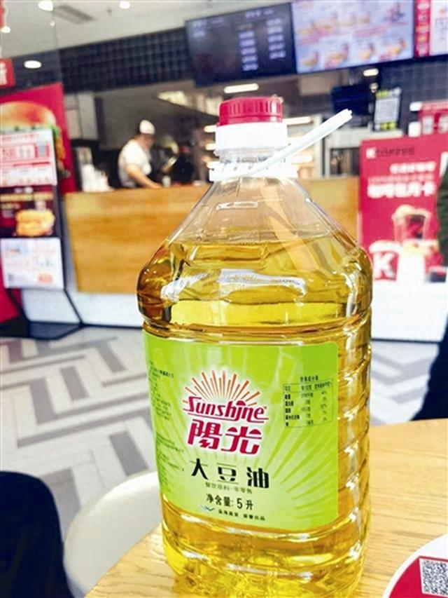 日前,记者跟随河西区市场监管执法人员在对一家肯德基进行巡查时发现,该店内有两桶标明为“益海嘉里荣誉出品”的“阳光牌”大豆油。该桶装油的显著位置还标明了“餐饮原料”“非零售”。执法人员仔细查看该产品的配料表发现,该产品标明加工原料为转基因大豆。