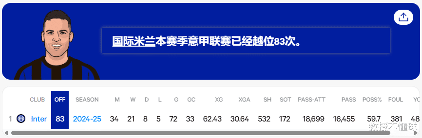数据也显示国米是欧洲五大联赛被判越位次数最多的球队之一,这说明他们的进攻时机本身就容易落入陷阱。