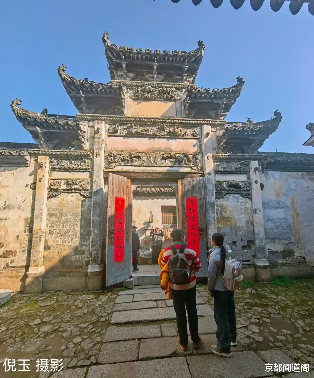 二甲祠则是查济村内极具代表性的祠堂之一,采用经典的五凤重檐式门楼,也就是传统五凤楼形制,建筑规制格外考究。门楼下部精雕“空城计”等经典戏文图案,雕工细腻、人物鲜活,门墙下方配有白石雕花墙裙,三级石阶之上,设有汉白玉护栏,两侧各摆放一方上马石,尽显大户宗祠的气派。这座祠堂地处“瑞凝午道”核心位置,历史上查氏族人查之恺曾获封“救驾王”,门庭之上曾悬挂“诰封荣禄大夫”竖匾,地位显赫非凡。祠堂门庭设计狭长,形成一处独特的过渡灰空间,进入厅堂大门两侧,设有标志性的抱鼓石,上方立有两根阀阅,这一规制在古代象征着极高的家族等级,足以印证二甲祠在查氏宗祠中的特殊地位。