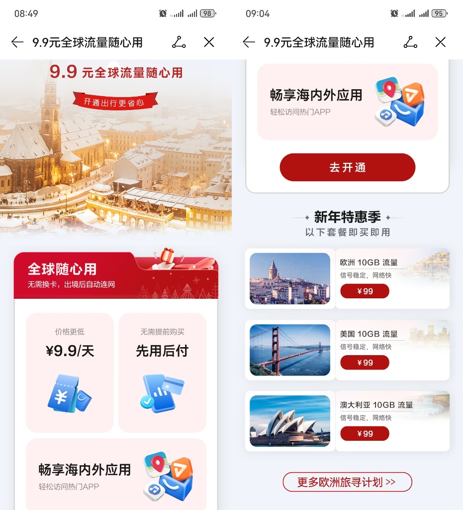 想要来一场说走就走的境外旅行,网络流量不可或缺。华为天际通推出“全球流量随心用”服务,支持先用后付,根据实际使用天数进行结算,无需繁琐的换卡流程,更无需提前购买流量包。只需简单开通,每次出境后便能自动连接当地网络,一次设置,次次便捷。在12月31日之前,通过天际通的“全球随心用”活动页面开通服务,就能享受到境外47个目的地每天仅需9.9元的流量包天超值优惠。此外,天际通新年特惠季还针对欧洲、美国、澳大利亚等热门旅游胜地,推出了99元专属超值流量套餐,包含10GB高速流量,有效期长达30天,即买即用,让你的上网体验更加流畅无阻。