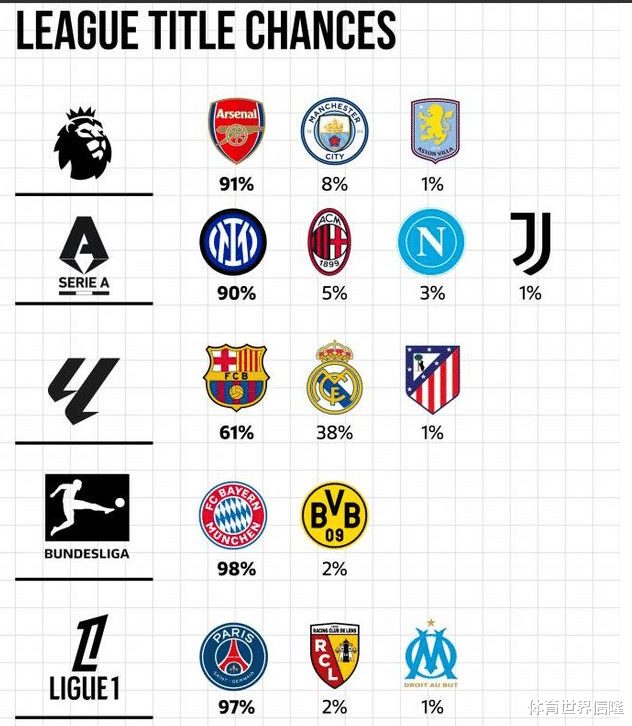 根据目前某数据机构的预测,五大联赛的领头羊夺冠概率都很高,即便是仅领先皇马1分的巴萨也被认为有61%的可能夺冠,阿森纳高达91%,国米是90%,而德甲和法甲霸主更是高达98%和97%,无限接近于百分百夺冠。