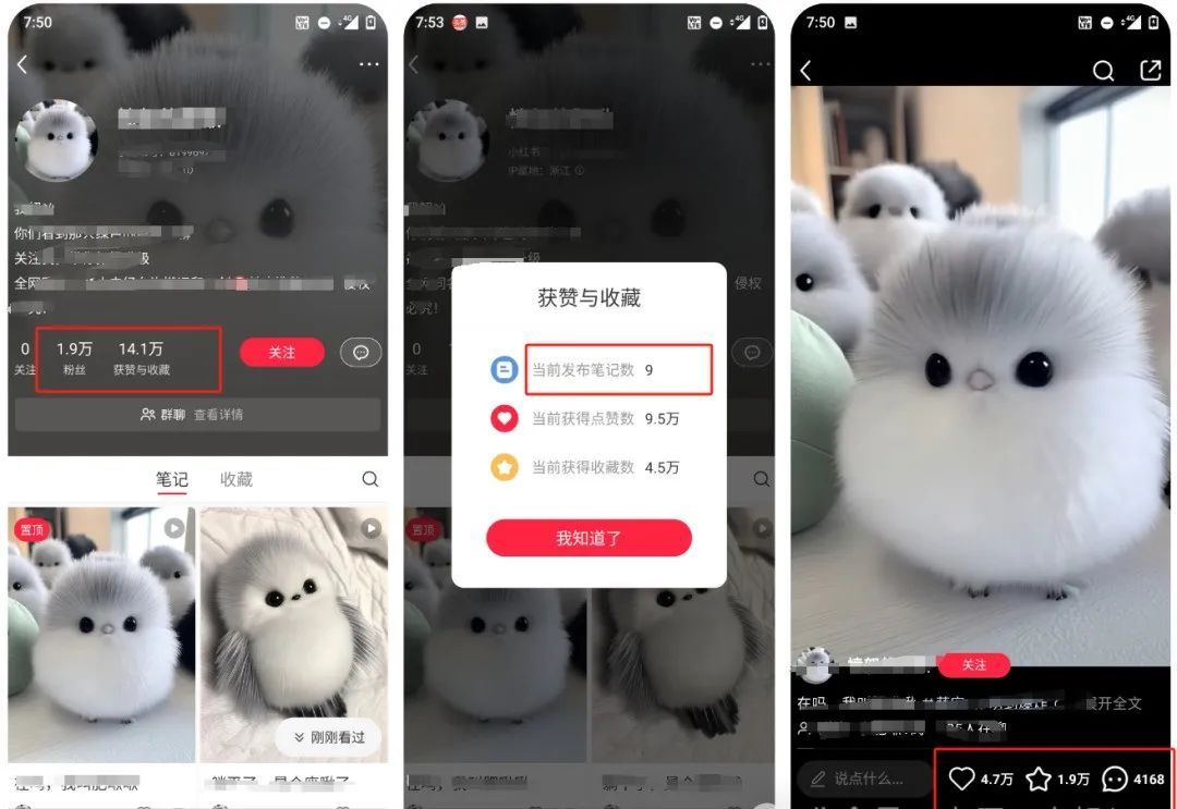 这个小红书账号发了9条作品,每个视频点赞量都特别高,数据好得离谱!这个账号只发了跟北长尾山雀很像的小鸟萌宠短视频,就有1.9万人关注了,点赞和收藏量更是达到了14.1万!其中最高的一个视频点赞量竟然高达4.7万!