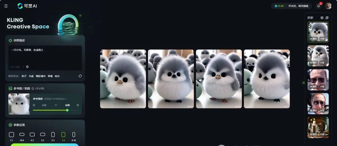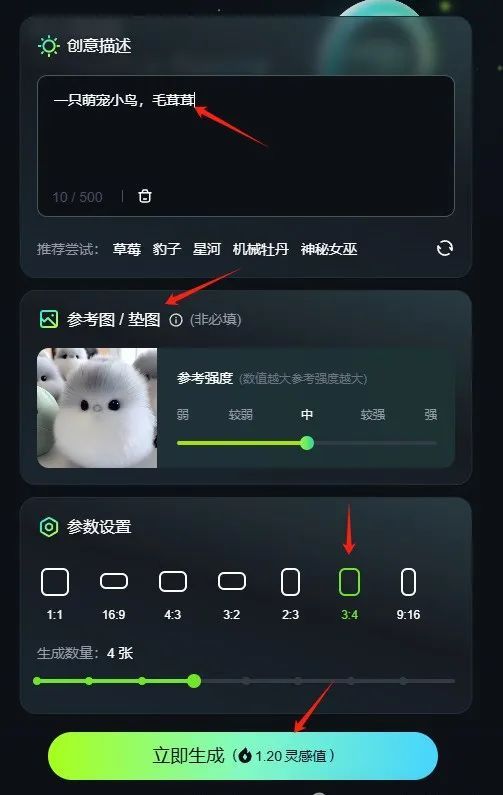接下来,生成一张萌宠小鸟图片。这里可以根据实际动物的外形描述,填写提示词,也可以上传一张参考图,让AI可以参考这个图片的风格来生成,选择参考强度,设置图片尺寸,最后点击图片生成即可。