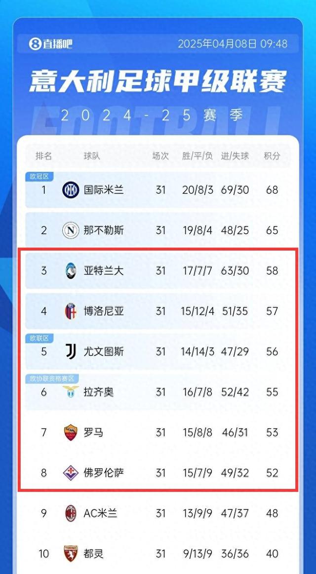 现在意甲还剩7轮比赛,争冠基本确定是国米和那不勒斯的较量。而争四可谓是惨烈,本轮意甲第3的亚特兰大被拉齐奥击败,现在他们仅仅领先第4的博洛尼亚1分。