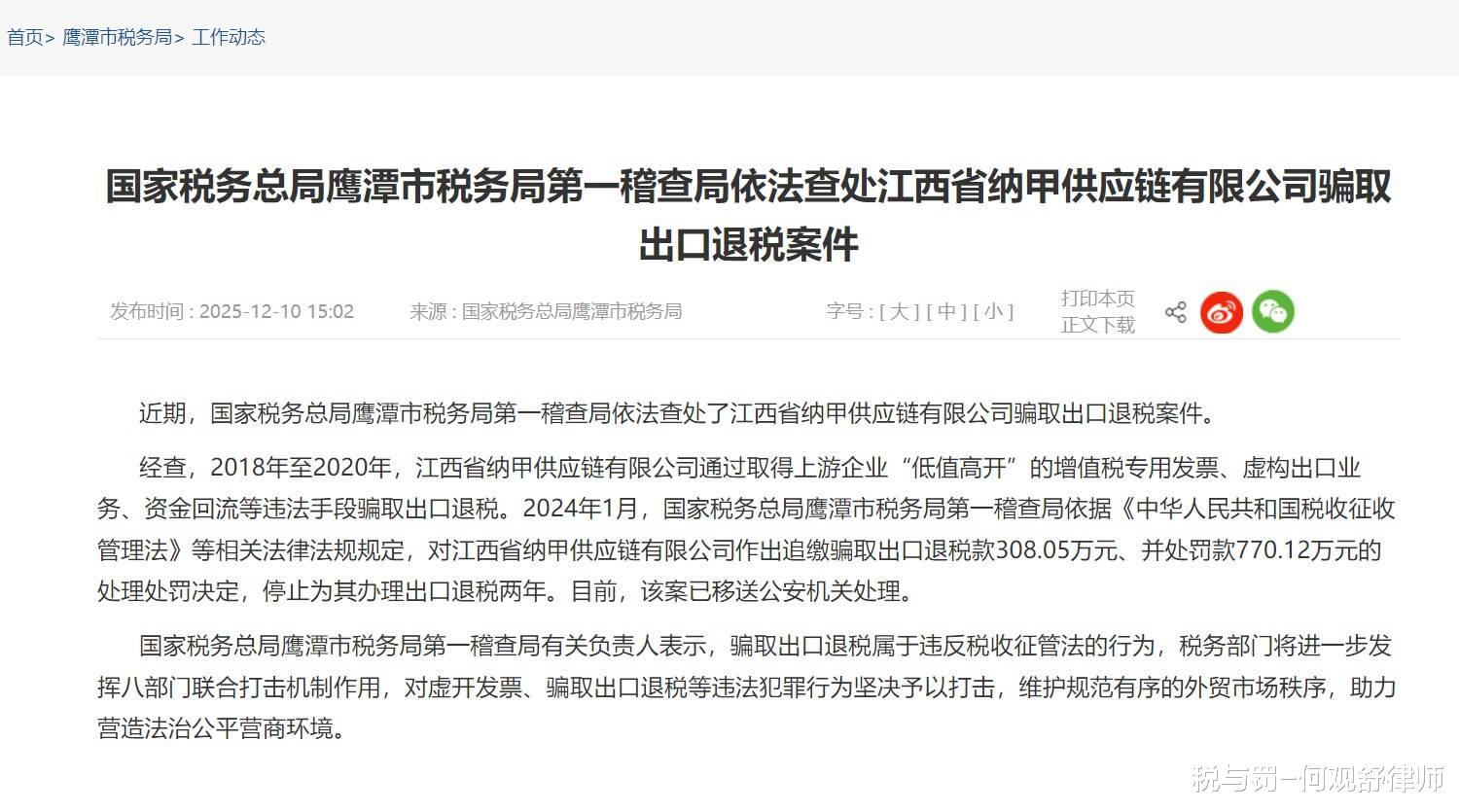 经查,2018年至2020年,江西省纳甲供应链有限公司通过取得上游企业“低值高开”的增值税专用发票、虚构出口业务、资金回流等违法手段骗取出口退税。2024年1月,国家税务总局鹰潭市税务局第一稽查局依据《中华人民共和国税收征收管理法》等相关法律法规规定,对江西省纳甲供应链有限公司作出追缴骗取出口退税款308.05万元、并处罚款770.12万元的处理处罚决定,停止为其办理出口退税两年。目前,该案已移送公安机关处理。