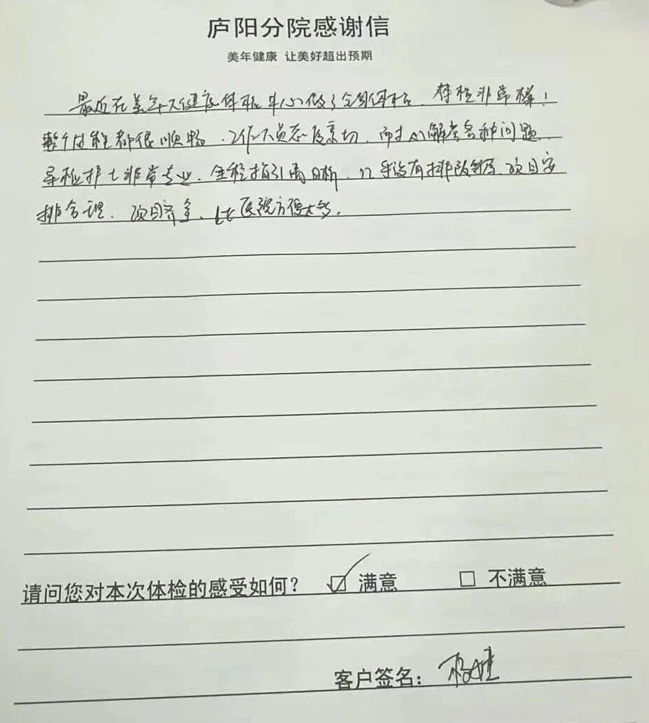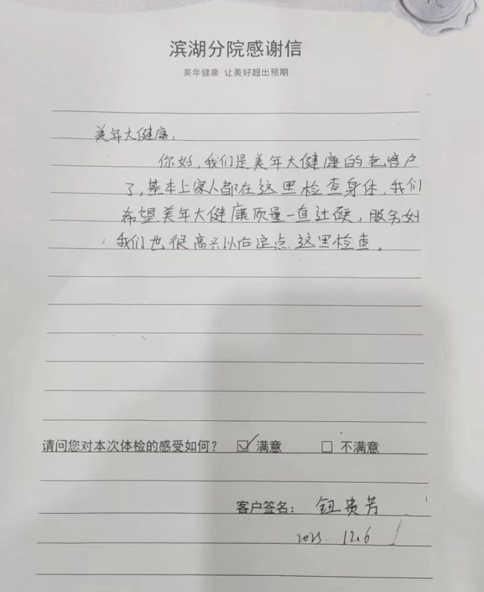 合肥体检选对不踩坑,人少、价优、服务好就来美年大健康一封封感谢信,是客户的心声,更是合肥美年大健康 “人少、价优、服务好” 的真实写照。# 合肥体检人少去哪?# 哪家体检便宜?# 体检哪家服务好 如果你还在为这些问题纠结,合肥美年大健康各分院用实际体验告诉你答案:从老客户的长久信赖,到新客户的初次认可;从人少不排队的高效体验,到价格划算的高性价比;从专业细致的医疗服务,到温柔贴心的态度,合肥美年大健康各分院始终坚守 “以客户为中心” 的初心,将 “专业、诚信、贴心、高性价比” 融入每一个服务细节。