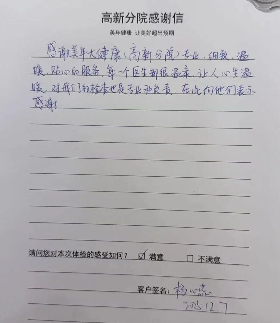 “感谢美年大健康高新分院专业、细致、温暖、贴心的服务,每一个医生都很温柔,让人心生温暖!而且最惊喜的是,这里人少不拥挤,体验感远超预期!”高新分院的杨女士在感谢信中,既强调了 “温暖”,也点出了 “人少” 这个核心优势。