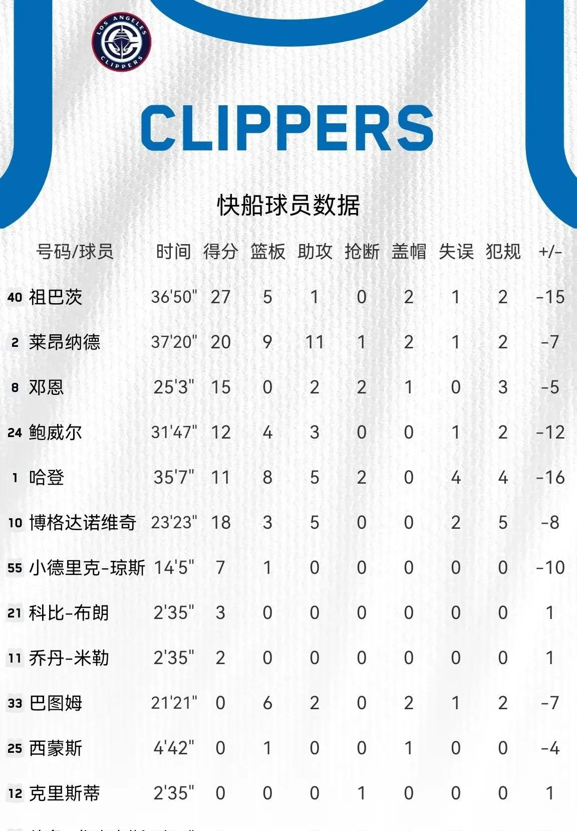 快船、掘金天王山之战,哈登没能经受住考验再次拉胯!莱昂纳德20+9+11准三双,博格丹迎来爆发18+3+5。祖巴茨 27