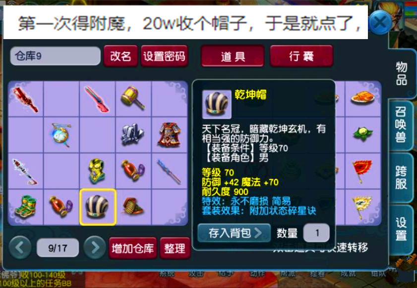 上面这位玩家刷大闹天宫副本任务的时候获得了一个80级的附魔宝珠,上面这位玩家没有选择卖掉,而是选择了自己点化花20万梦幻币,收了一个70级简易不磨的头盔。没想到点画出来的居然是碎星诀的套装,现在上面的这件头盔是可以给69级凌波城门派的玩家使用的。简易加永不磨损的特效能够让69级刷任务的时候不消耗耐久度,而且还能够享受三个符石孔位的效果,所以上面的这位玩家是没有亏钱的,这件装备绝对能够卖得回本钱。