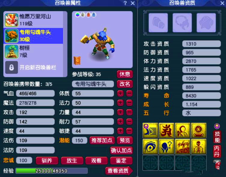 上面这位玩家新购买了一只八技能、三个特殊技能的个性牛头,这只牛头拥有的特殊技能是出其不意,诸天正法和善恶有报,现在召唤兽身上拥有着5个红色技能,剩下的那三个蓝书技能中的冥思是没有用的,红书技能中的高级鬼魂术也是没有用的,所以上面的这只召唤兽还是有可以打书空间的,将高级必杀跟吸血打上去,这只召唤兽会更好用,但是这种召唤兽打掉特殊技能的几率也会特别的高,如果这是你们的召唤兽,你们会怎么办?