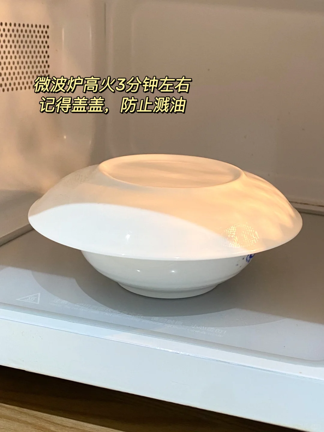 倒掉碗中的水重新加入同样体积的水,然后用保鲜膜盖起来,上面扎几个小孔,放进微波炉当中,加热8分钟,可以再焖2分钟。