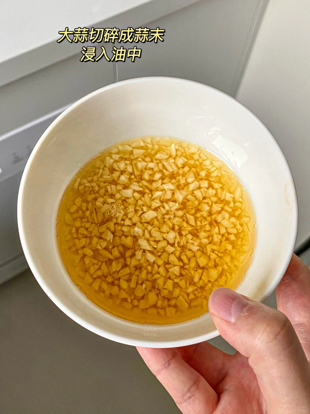 用微波炉做蒜油更加省事,把大蒜切碎之后放入碗中,然后加入油,完全侵入油中之后,放入微波炉当中,高火三分钟左右,